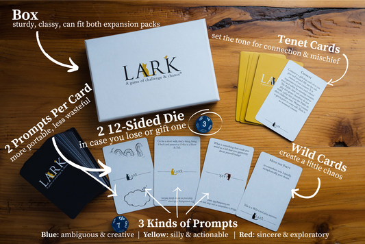 "I've played it in 20 minutes with friends before dinner where we draw a few quick cards to laugh and connect, in hours-long sessions where we make our way through all the cards in the deck, and in lengths and settings in between... Lark is a joyful experience!" - Olivia L